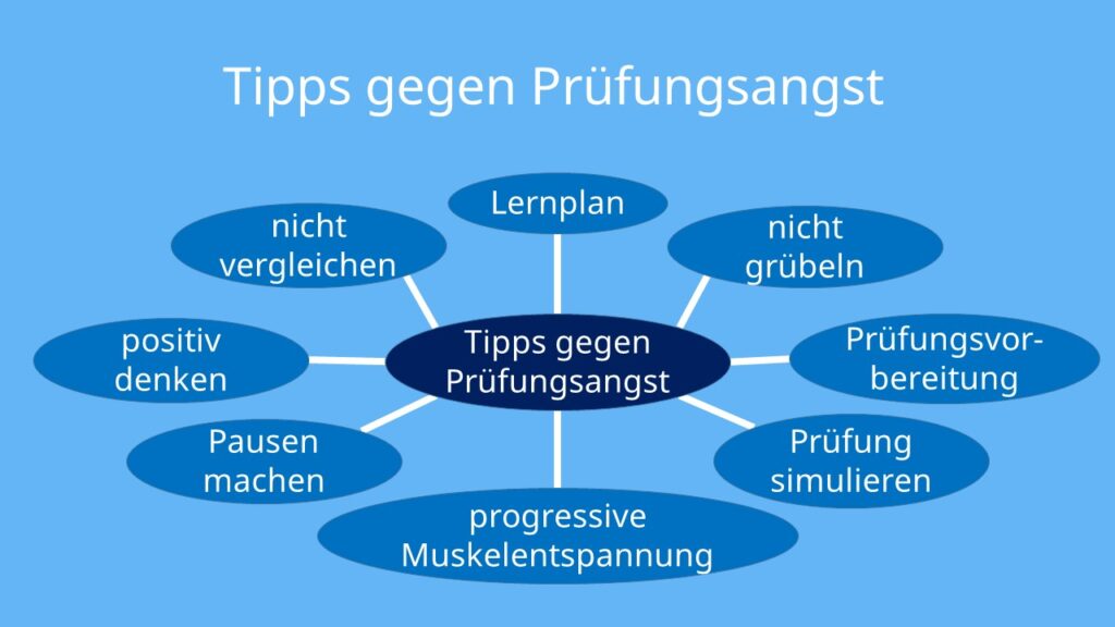 Stress und Nervosität können durch verschiedene Entspannungstechniken reduziert werden. Versuche Meditation, Tiefenatmung oder Progressive Muskelentspannung. Sorge für ausreichend Schlaf in der Nacht vor der Prüfung und verzichte auf Koffein, das die Unruhe verstärken kann. Besuche ruhige Orte, die dir helfen, dich zu beruhigen. Zudem kann es hilfreich sein, mit Freunden oder der Familie über deine Ängste zu reden und Unterstützung zu suchen.