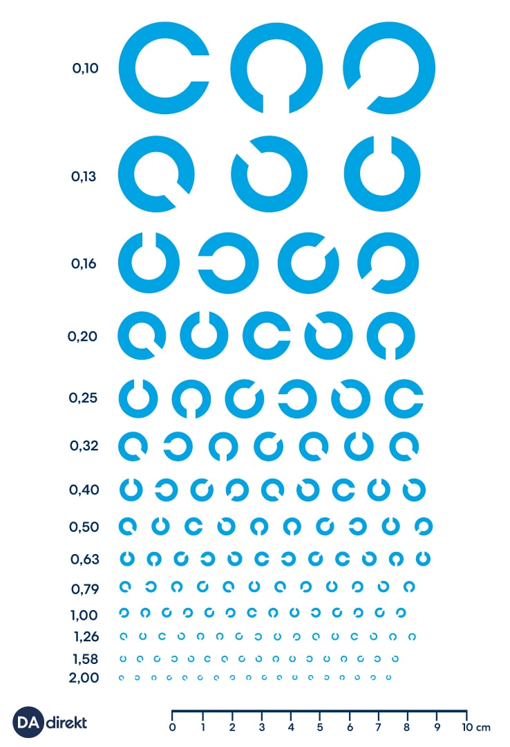- Die Sehschärfe wird in Dezimalwerten angegeben, wobei 1,0 die normale Sehschärfe entspricht.