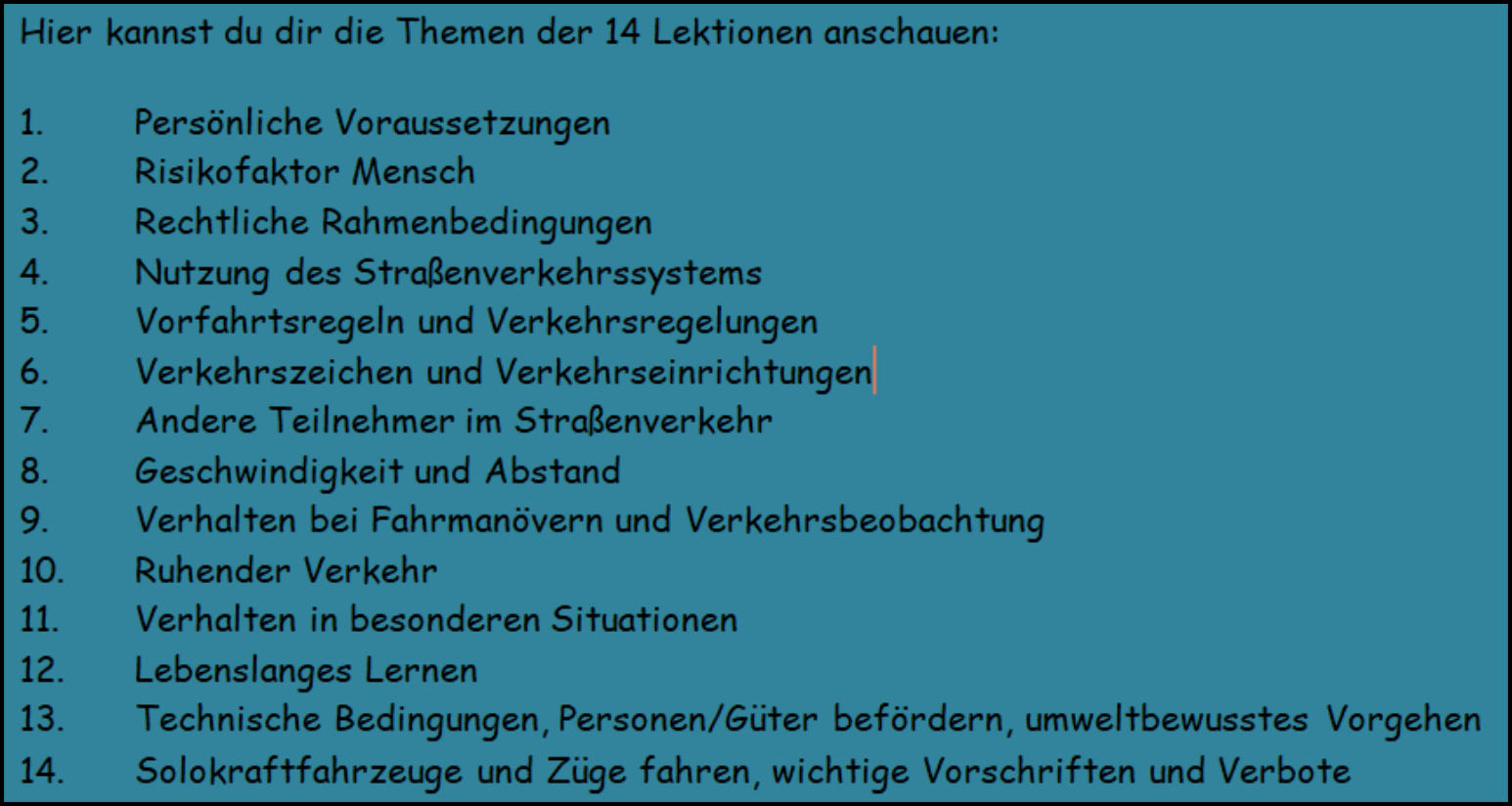 - Selbstständiges Studium des Fahrzeugführerscheins und der dazugehörigen Prüfungsmaterialien ist ebenfalls empfohlen.